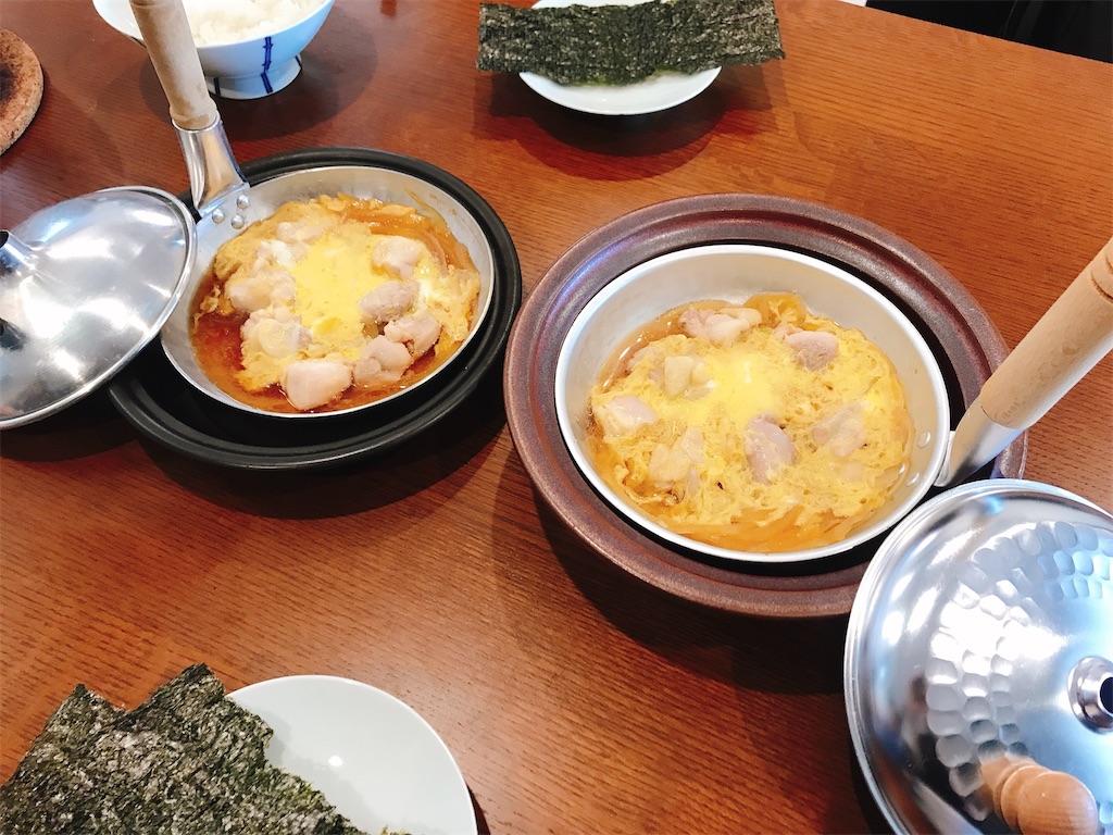 - 親子鍋に具と煮汁を入れて火にかけ、蓋をして火が通ったら卵を回しかける。